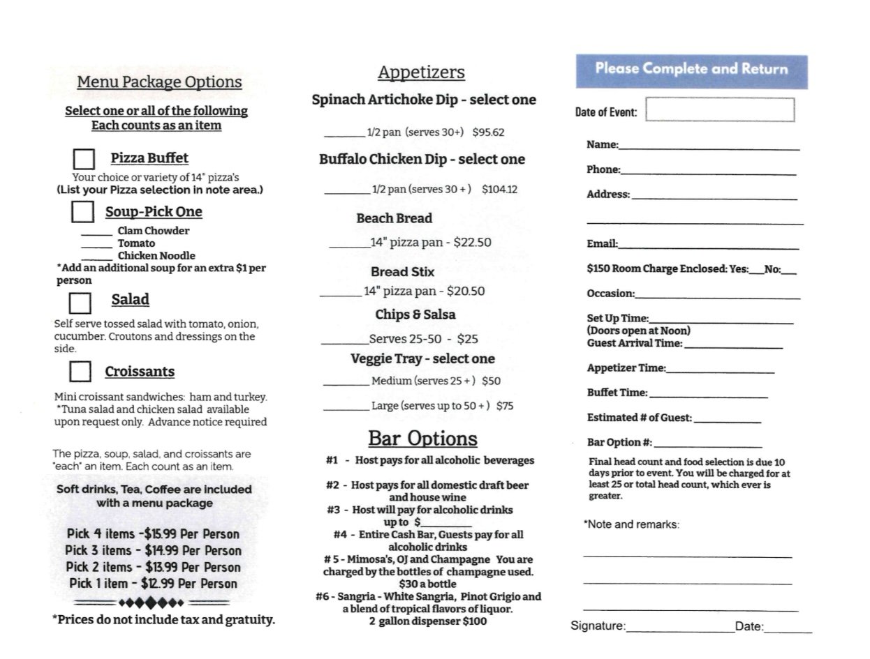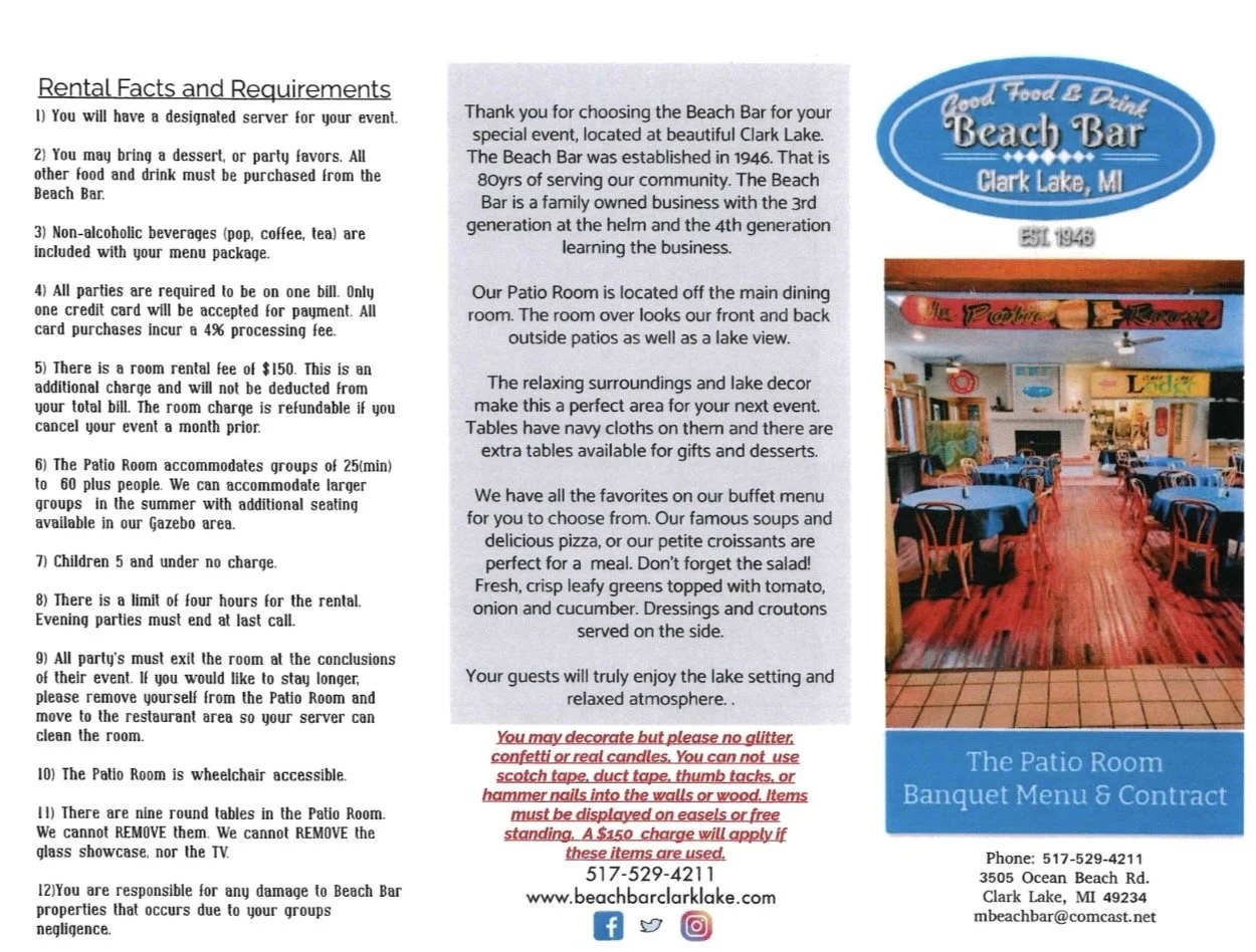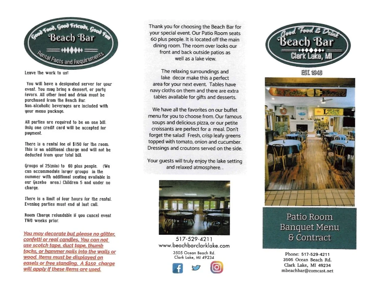 For your next shower, special event, birthday party, or rehearsal dinner, consider the Beach Bar’s Patio Room! Overlooking the front and rear patio as well as the lake, the Banquet Room offers a fireplace with seating for up to sixty plus people. For more information, contact the Beach Bar at 517-529-4211 or email us. .
